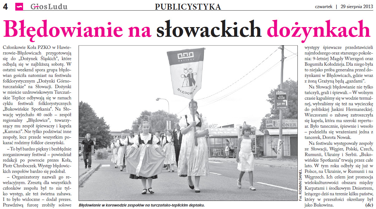 | ZR Błędowice w Turčianskych Teplicach | 24.8.2013 | ZR Błędowice wystąpił na Bukowińskich Spotkaniach w Turčianskych Teplicach - międzinarodowym festiwalu folklorystycznym z udziałem zespołów ze Słowacji, Polski, Węgier, Rumunii i Serbii.
