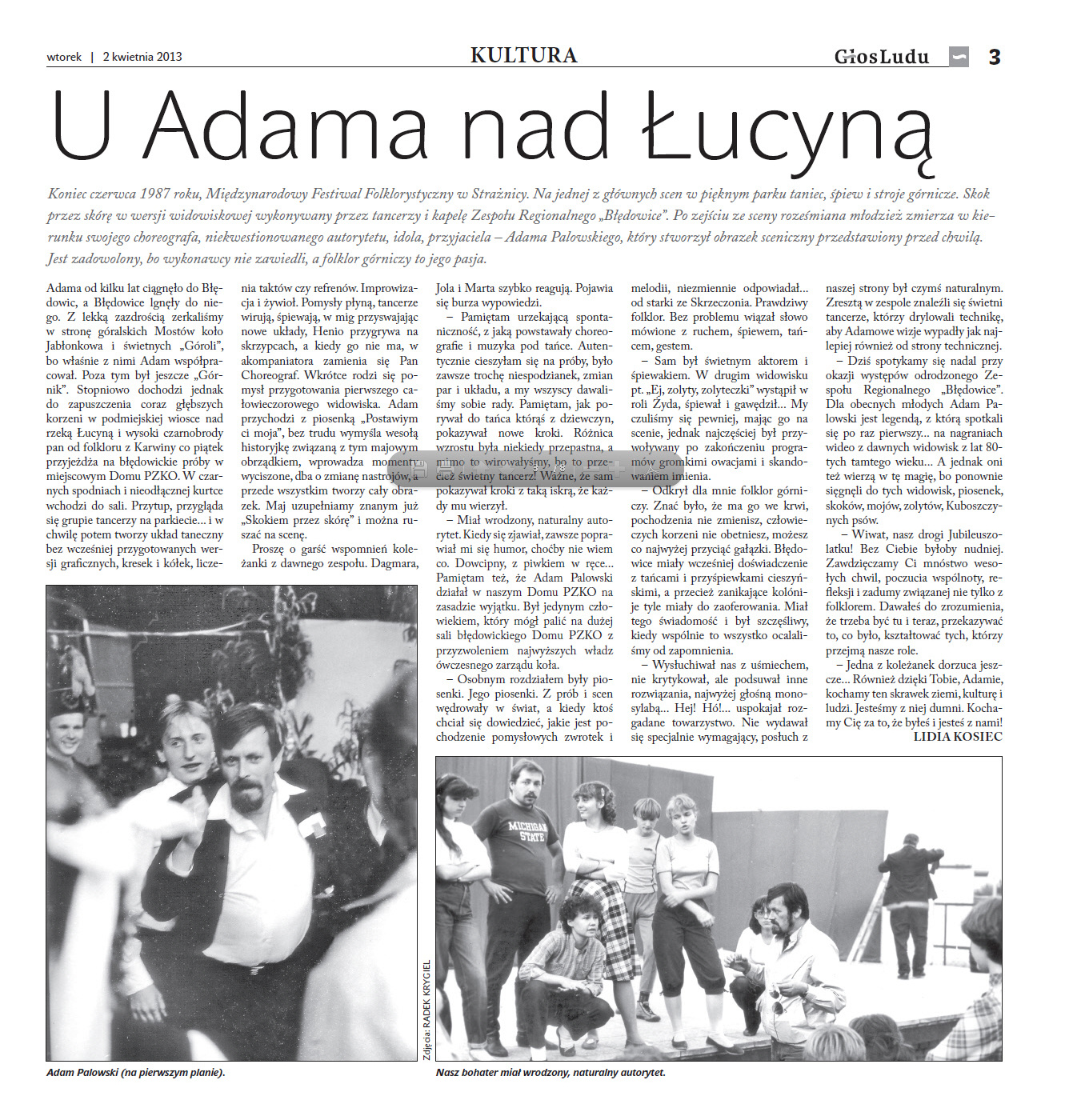 Artykuł Ludii Kosiec U Adama nad Łucyną publikowany w Głosie Ludu 2.4.2013 czytaj tu. Kopia całego wydruku jest do dyspozycji na stronach archuwim GL.